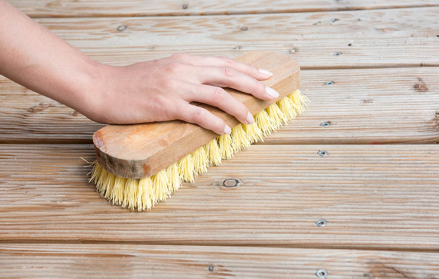 Holzterrassen sind starken Witterungseinflüssen ausgesetzt, besonders, wenn eine Überdachung fehlt. Damit Holzdielen viele Jahre lang ihre schöne Optik behalten, brauchen sie besondere Pflege. Die Behandlung mit Holzöl ist empfehlenswert. Vor dem Streichen des Terrassendecks mit Öl sollten die Holzdecks gereinigt werden. Am besten wiederholen Sie diese Grundreinigung einmal im Jahr.